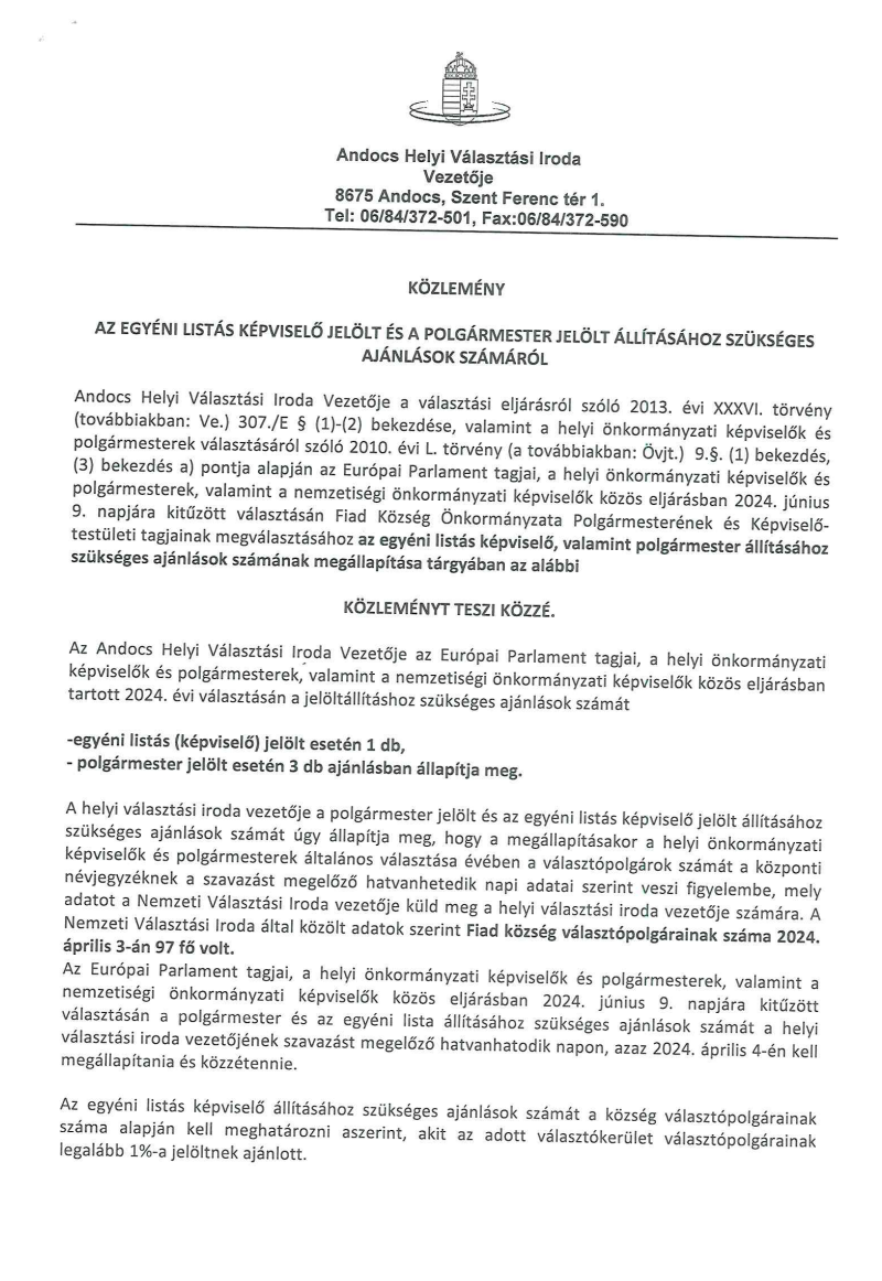 Fiad közlemény ajánlások számának megállapításáról Fiad közlemény ajánlások számának megállapításáról